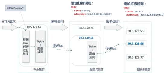 整体调用链路总结。满足灰度验证的用户链路:web 服务 -> 30.5.120.16 -> 30.5.128.66; 不满足灰度验证的用户 (不打标) 链路:web 服务 -> 集群中 30.5.120.16 之外的机器 -> 集群中 30.5.128.66 之外的机器。