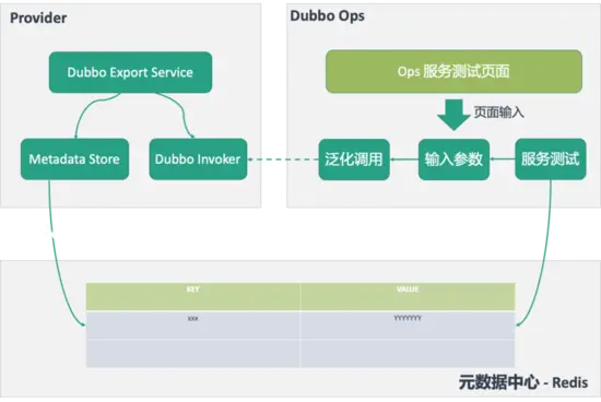 服务测试是在 Dubbo OPS 后台中的功能。服务测试业务流程:先去元数据中心获取元数据信息;在页面中展示服务的结构体,等待用户输入;用户输入参数信息;Dubbo OPS 后台根据元数据信息和用户输入的参数构造出服务调用的入参,向相应的 Provider 发起泛化调用。泛化调用被较多的网关系统使用。
