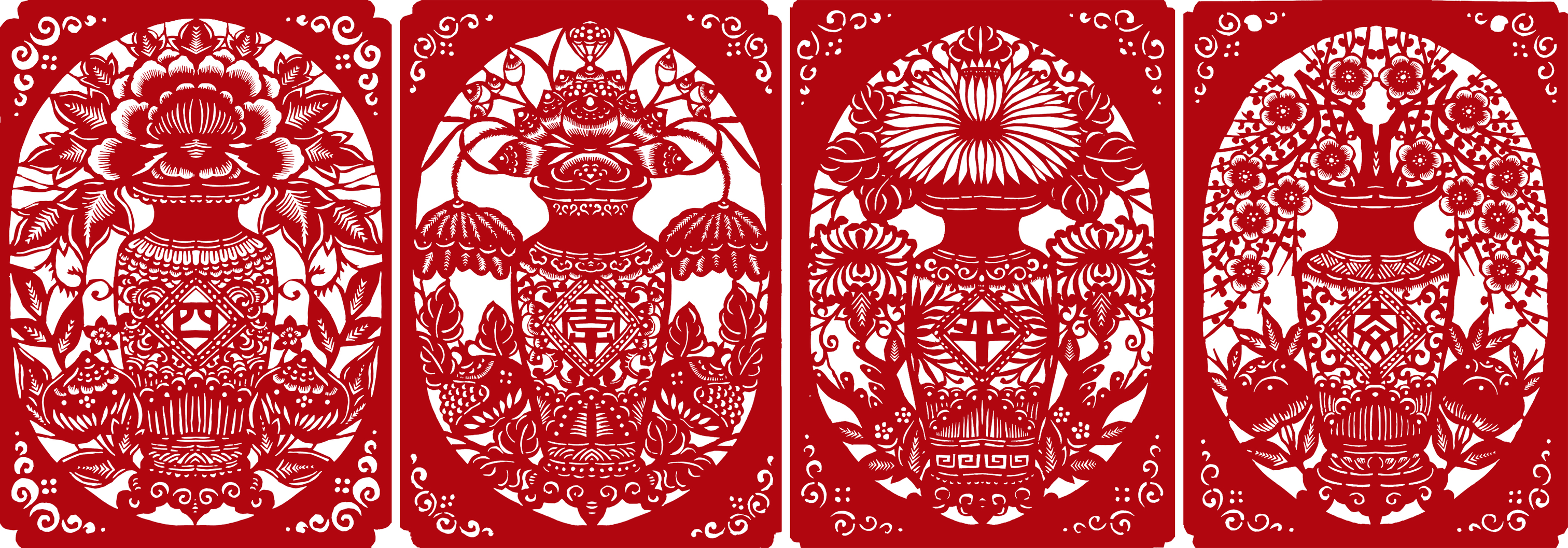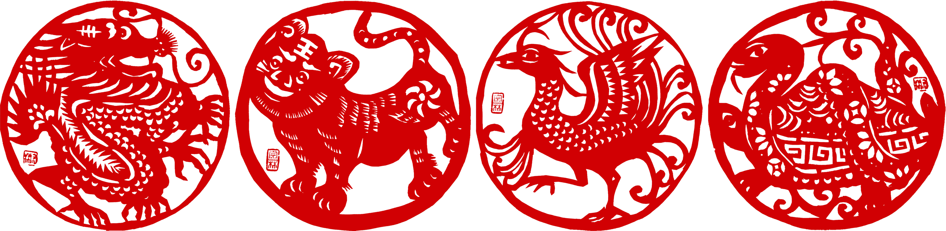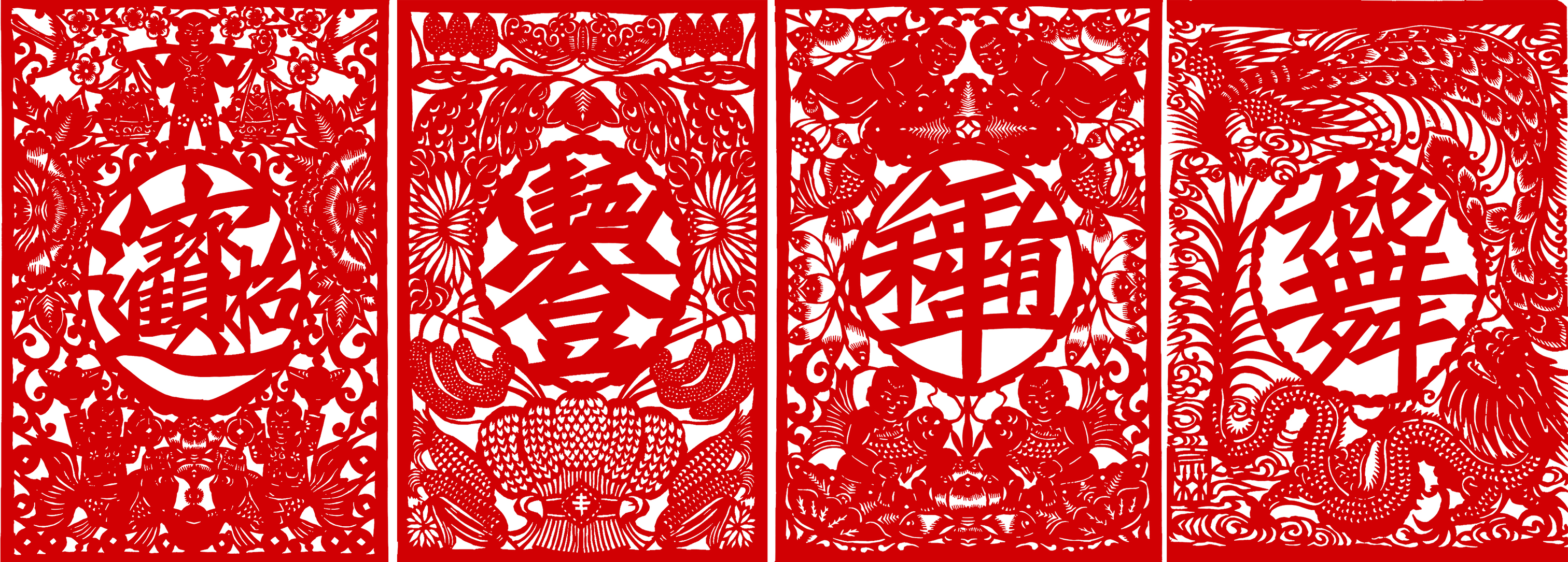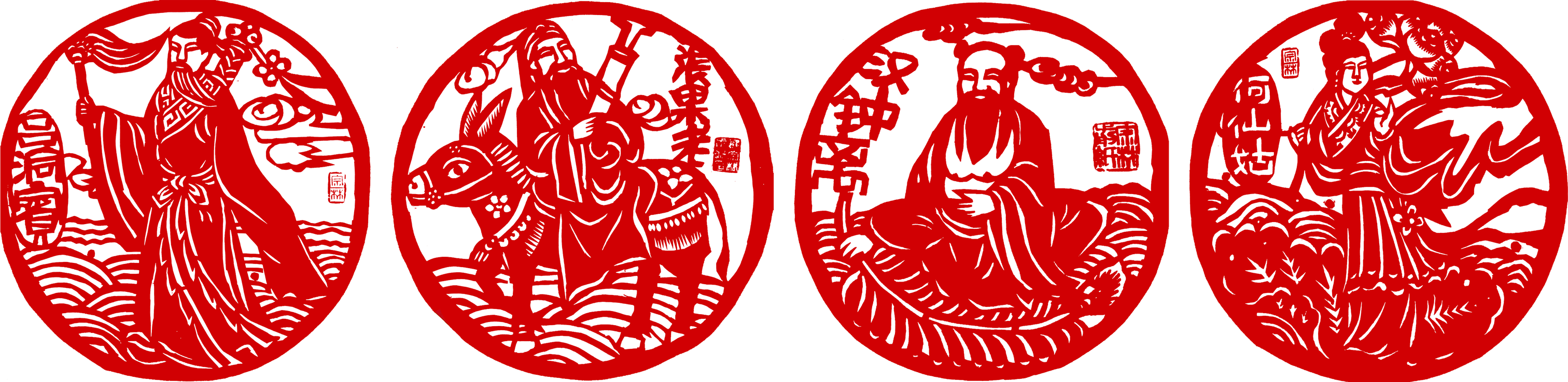 后来,我看到正方形剪纸印的形状单一,就剪了些长方、圆形、椭圆、瓦当等,在一组作品中就可形式多样,以避免欣赏疲劳。我还根据不同的印文内容,采用不同色彩的印纸,有时用两种色纸粘连成彩色剪纸印,以增加喜气,使色彩更丰富。由于剪纸印材料经济、制作快捷、美观大方,除单独欣赏外,我常常根据需要把它作为大幅剪纸的补饰设计其中,在装裱剪纸作品时根据作品内容配剪图题或者姓名印,增加了实用性,丰富了大众的审美需求。
