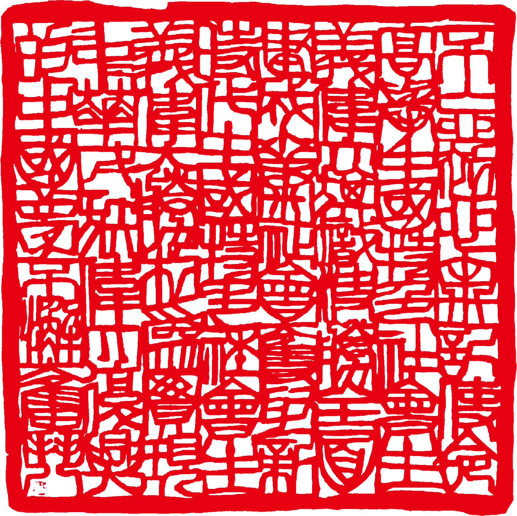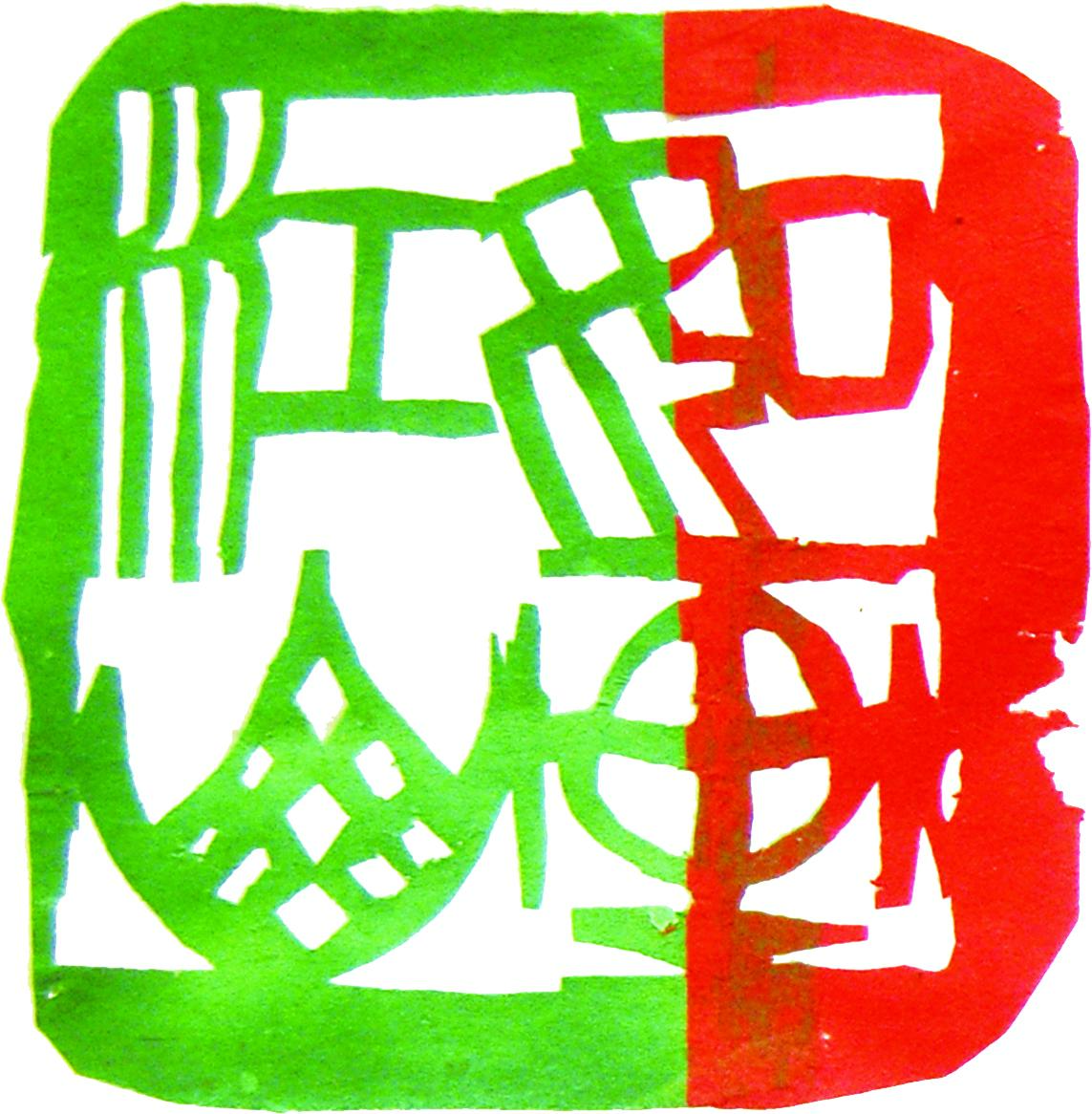在尝试阶段,我首先要解决阳刻剪纸印中“线线相连”的问题,以免线条断离散落。阳刻剪纸印中为了保持文字的完整性,我用白纸剪印文,贴在印纸上使印面文字不间断,实践后效果不错。在阴刻剪纸印时,则让线条适当断离,以防线条段落印文不完整,有失剪纸语言。初次剪了8 厘米见方的剪纸印,展开后发现线条及边框工整,线条连接得很好,没有断落的现象,但呆板没有生气,失去了篆刻的金石味。如何表现剪纸印的金石味和纸味呢?我想如果在白文处理上做些适当地粘连,用撕纸法处理边框,呈现出一种破残的自然美,会更符合剪纸语言,也有了篆刻的金石味,试剪了几方,果然效果非常好。