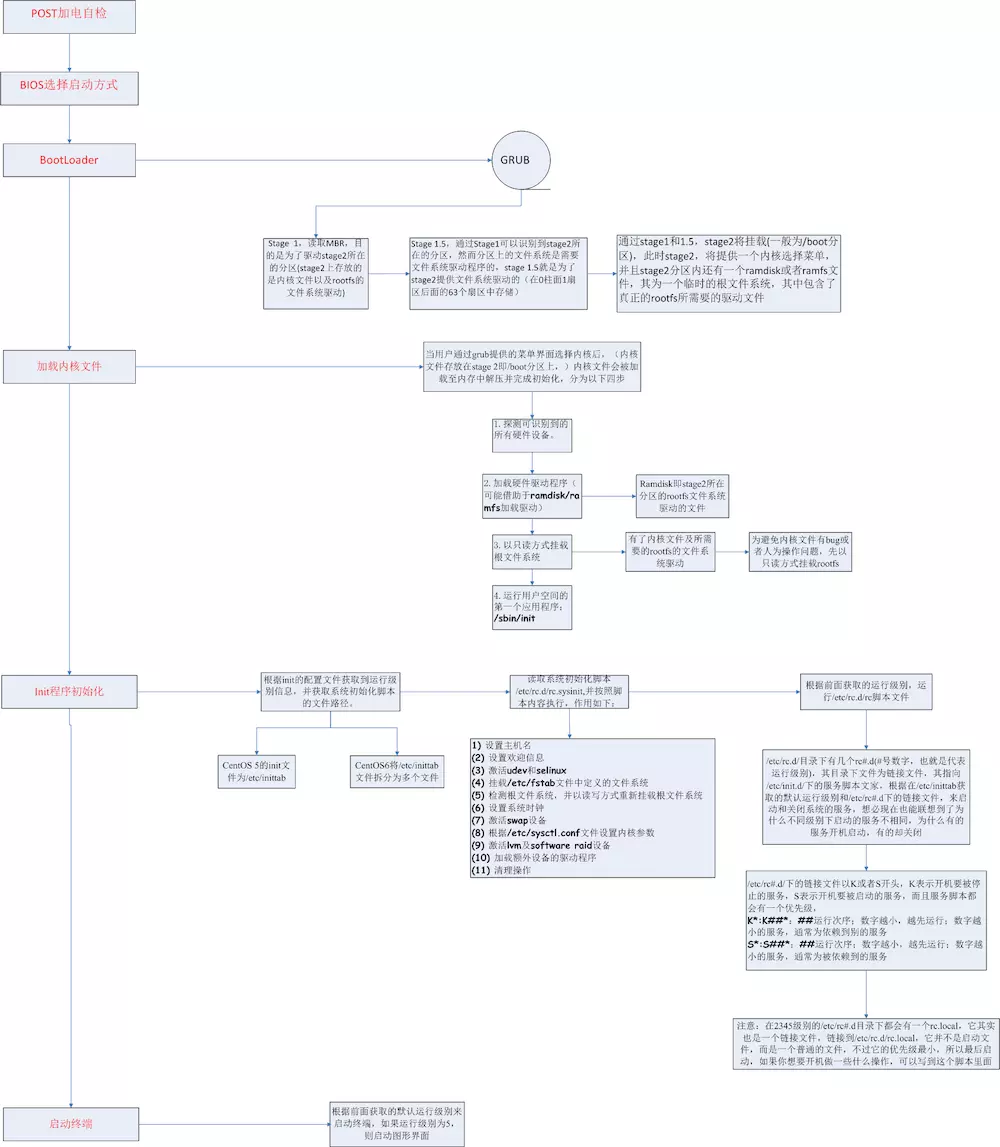 俗话说的好,一图抵千言,我将上面所述的启动流程又画了一幅图,希望以更加清晰地描述CentOS的启动流程。