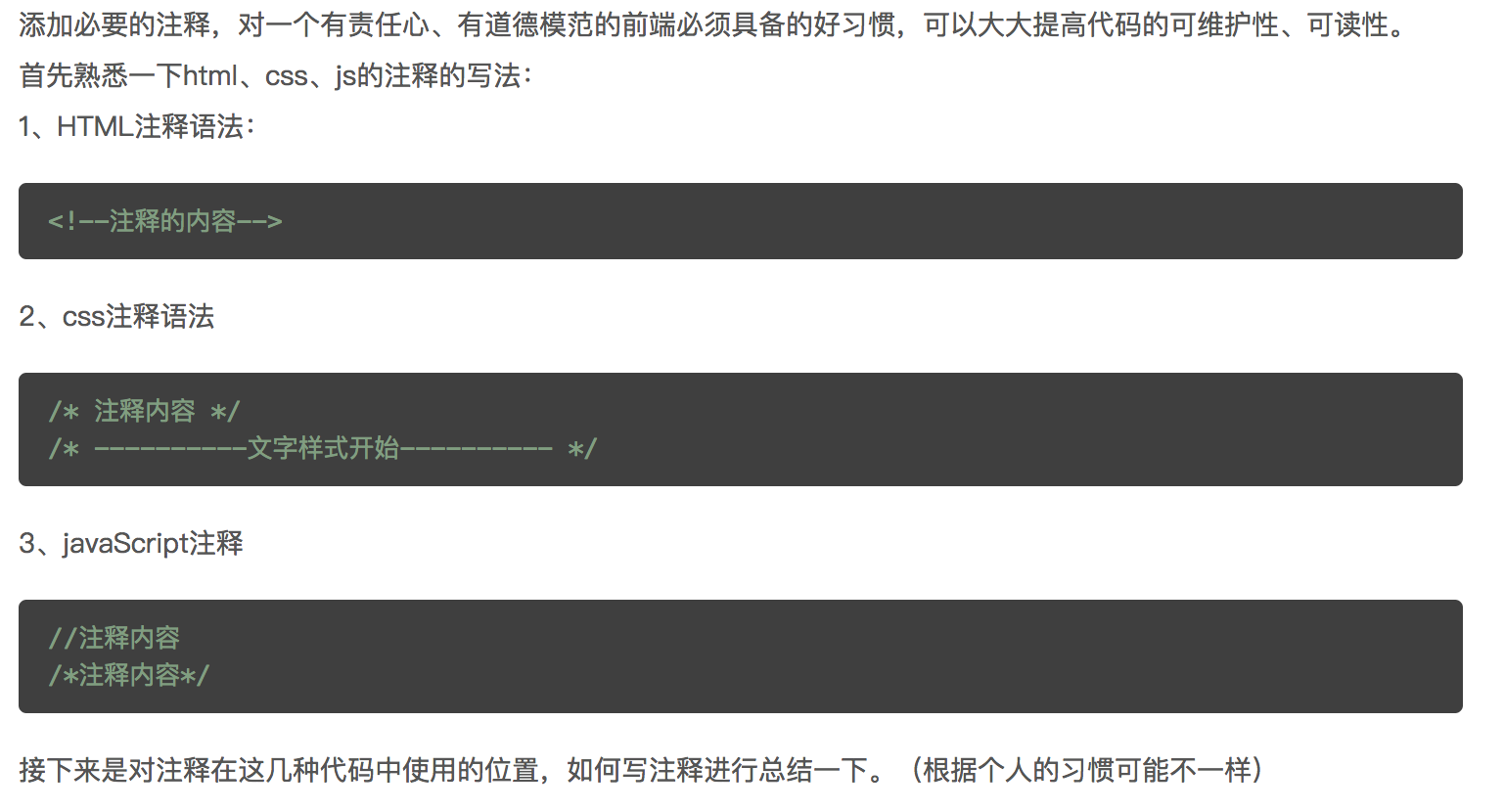 添加必要的注释,对一个有责任心、有道德模范的前端必须具备的好习惯,可以大大提高代码的可维护性、可读性。 首先熟悉一下html、css、js的注释的写法: