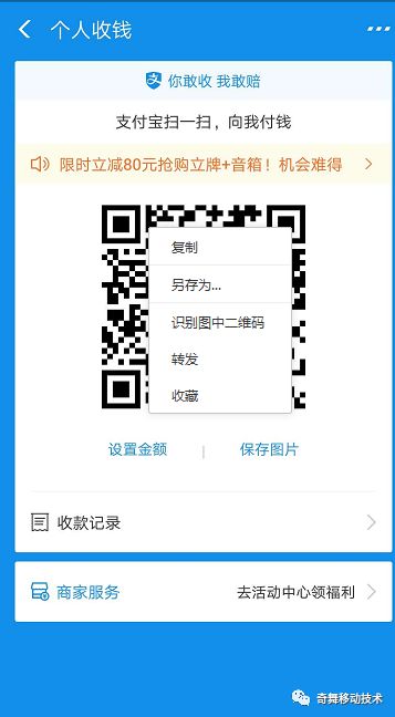 这样就很容易的拿到我们自己设置支付宝金额与备注的收款码了。比如 qrCodeUrl 就是长这样:"https://qr.alipay.com/sldgjsdlgjio23o8hned9nd?t=1546998123456"