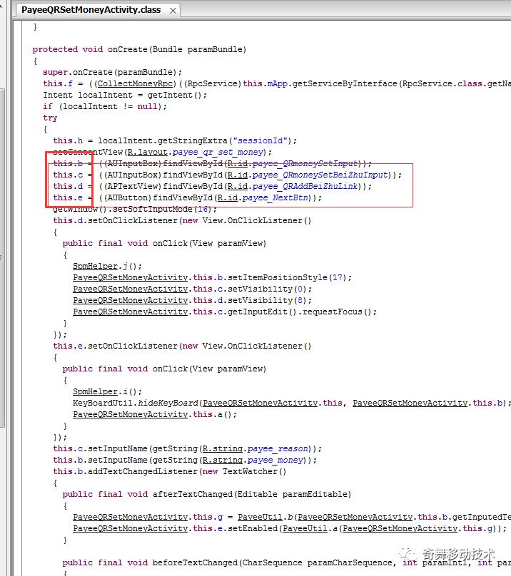 XposedHelpers.findAndHookMethod("com.alipay.mobile.payee.ui.PayeeQRSetMoneyActivity", lpparam.classLoader, "onCreate", Bundle.class, new XC_MethodHook() {