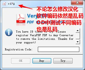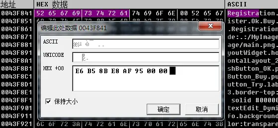 修改后,生成新的qtcore4.dll文件,替换原版qtcore4.dll就会发现,再去汉化此软件,乱码问题已经解决了。我们依然以汉化题目为示例,OD中修改数据(如果你是大量汉化工作就别用OD了否则累死哦),注意要是utf-8的内存编码形式,关于编码常识可以在公众号内回复“编码”阅读,也可以点此链接 编码常识 ,修改标题registration为“测试”,“测试”的utf-8内存编码模式16进制数据是E6 B5 8B E8 AF 95 ,转换方法如下,有兴趣的也可以自己写工具