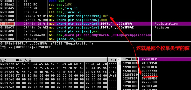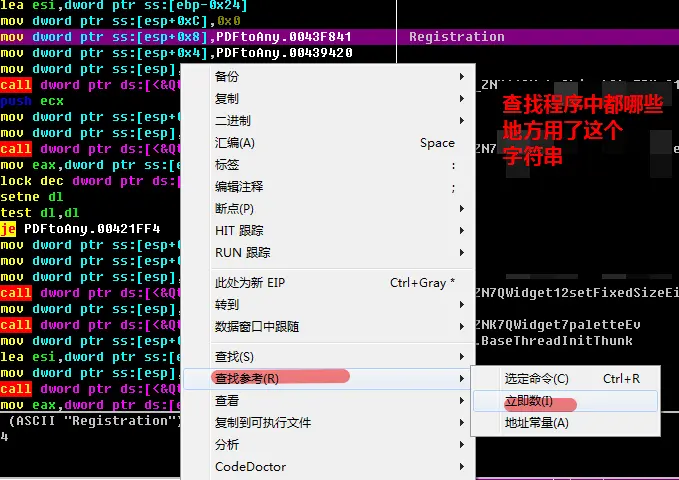 程序载入OD,定位"registration",并查看,程序中都有那些位置会调用这个字符串,如图