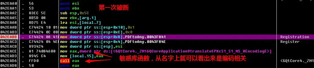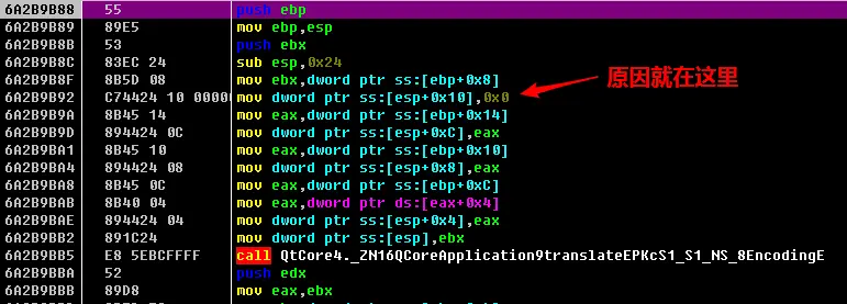 断点下好后,运行程序,观察调用字符串的逻辑流程,发现下的三个断点中有两个在程序启动会被调用,调用的目的分别是作为两个QT库函数的参数,如下图