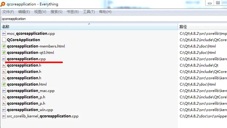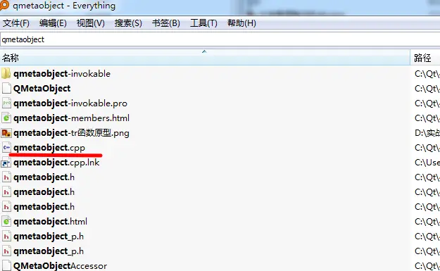 安装QT后就可以看QT各种库函数的源码和资料,如果你想更深入的了解,给吃透的话,最好的方式莫过于自己开发,自己逆向分析。 开始寻找目标函数源码,everything搜两个函数类命,QCoreApplication和QMetaObject,如下图