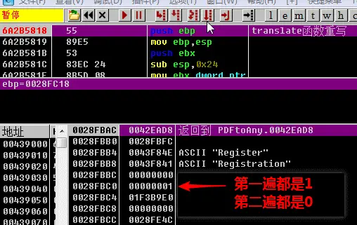可见,两个函数其实最终调用的都是第一个函数,而核心关键点就是枚举类型参数的值,那么我们在第一个库函数入口【6A2B5818】下断点动态运行一下,堆栈中观察参数的变化,如下动图