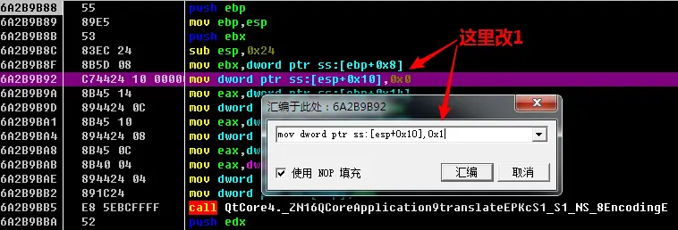 修改库函数QMetaObeject::tr,让他调用QCoreApplication::translate时,枚举参数设置成1,也就是压根用逆向的方式把QMetaObeject::tr函数改成了QMetaObeject::trUtf8,好处通用性较强。
