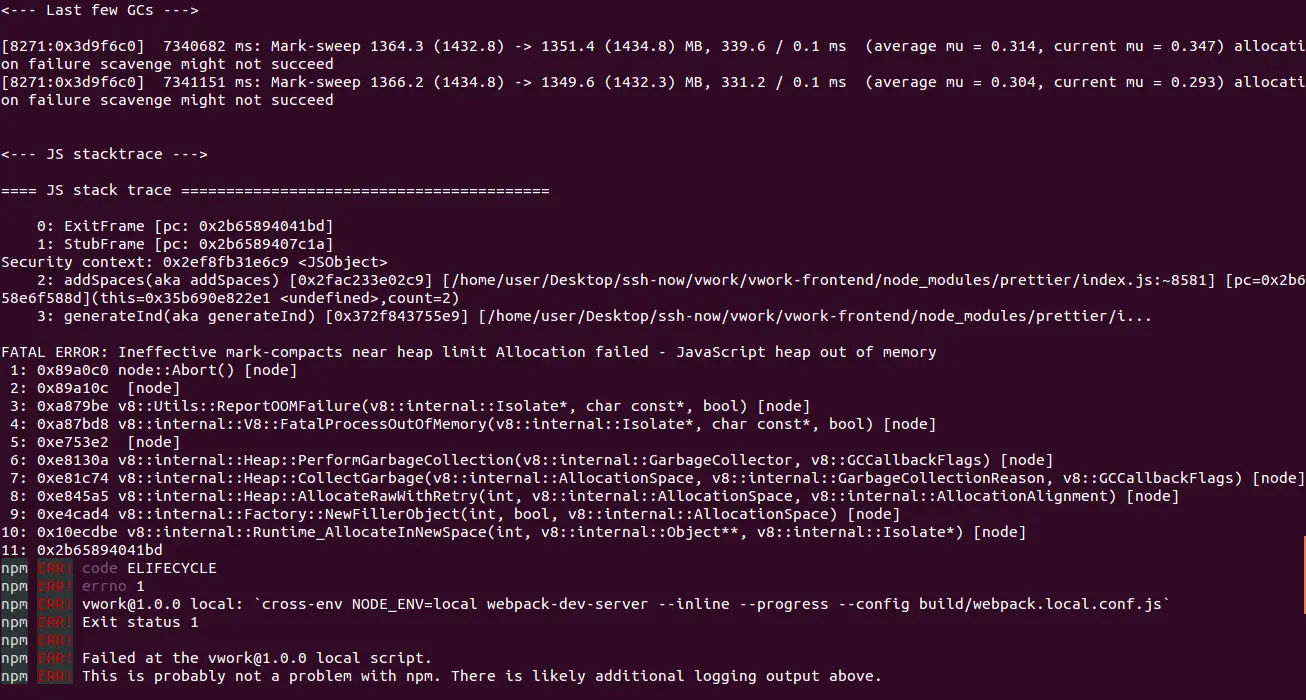vue项目编译node内存溢出 llla 2019-01-18 2,128 阅读1分钟 问题截图: 参考博客 解决方法 目前并没有什么特别好的解决办法,治标不治本的办法就是给node进程分配更多的内存... npx --max_old_space_size=4096 vue-cli-service serve