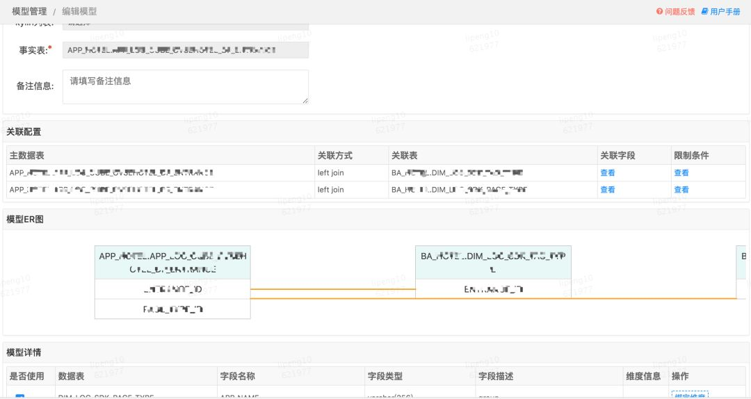 模型管理模块能够还原业务落地后数据表的组织关系,包括:数据表的关联方式(join、left join、semi join等)、数据表的关联限制、模型ER图、模型包含字段、模型字段与维度的绑定关系、模型与指标的绑定关系。
