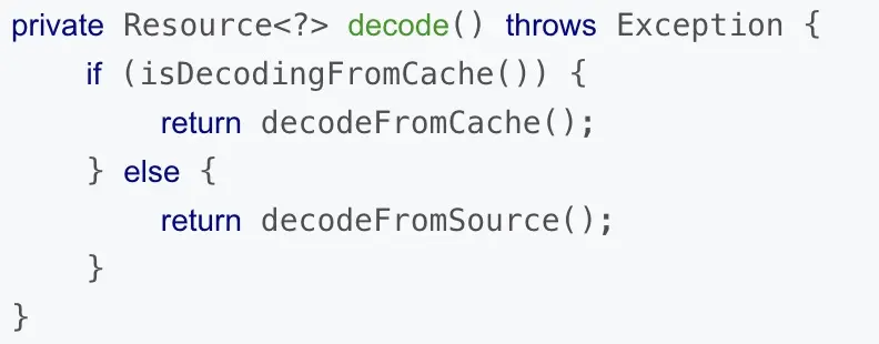 我们先说说硬盘缓存的资源管理机制,其实Glide在这里也是采用LRU算法进行管理,这里就不对Glide的DiskLRUCache工具类进行解析了,有兴趣的可以自行搜索。上头说到,Glide在内存缓存中没有找到对应的图片资源后,便会开启新的子线程进行图片加载,此时会执行EngineRunnable的run()方法,run()方法中又会调用一个decode()方法: