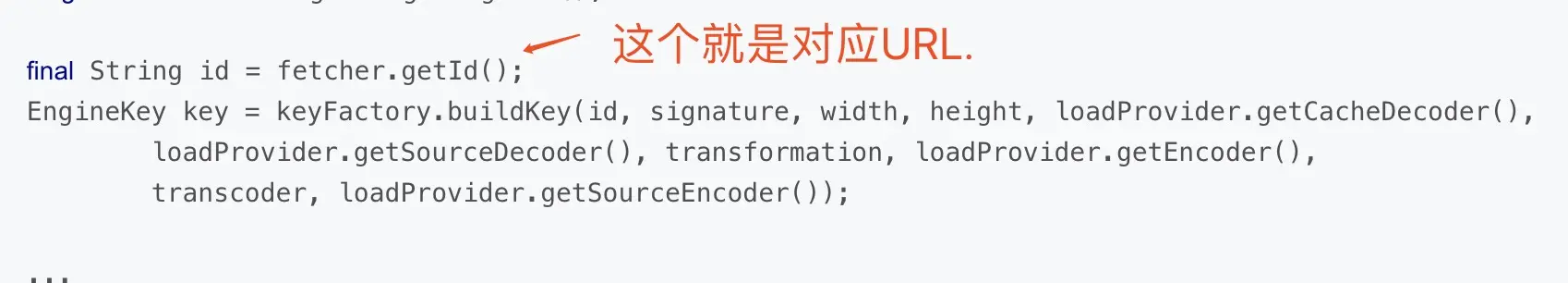 在源码里查看可以知道,每一次的load方法内部,都会有一个fetcher.getId()方法获得了一个id字符串,这个字符串也就是我们要加载的图片的唯一标识,比如说如果是一张网络上的图片的话,那么这个id就是这张图片的url地址。然后,这个id会结合signature、width、height等等10个参数一起传入到EngineKeyFactory的buildKey()方法当中,从而构建出了一个EngineKey对象,这个EngineKey也就是Glide中的缓存Key了。