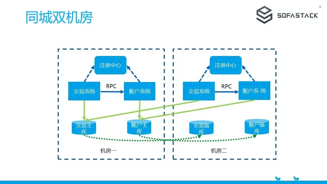 业务还是不断扩展,系统也越来越多,当系统节点到一定数量的时候,单个物理机房已经无法承受。另外考虑到同城容灾的问题,支付宝就在同城再扩建另外一个机房,通过专线部署为一个内部网络,然后将应用部署上去。
