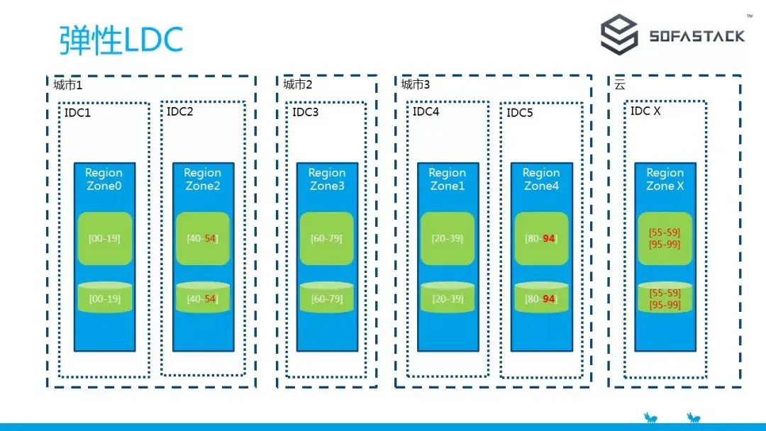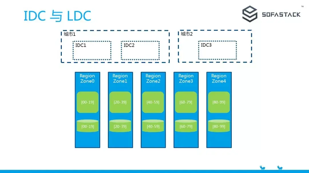 我们把这种逻辑单元称之为 RegionZone。在实际的部署过程中,物理数据中心 IDC 和 逻辑单元的数量没有完全的对等关系。例如图中我们物理机房可以是两地三中心,而 RegionZone 则是分为五个。
