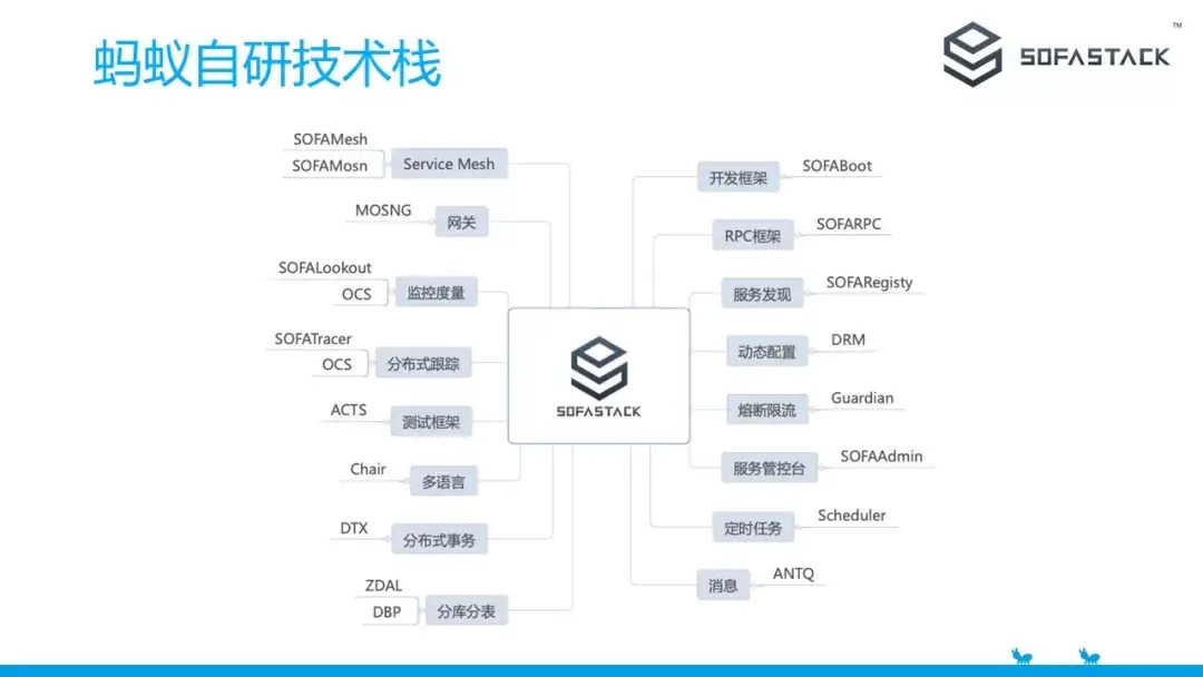 从前面的服务化演进可以看到,蚂蚁的微服务架构面临的场景已经慢慢从简单的远程调用发展到要面临复杂的三地五中心异地多活场景,为了支持这些场景,蚂蚁中间件自研了一套中间件 SOFAStack。