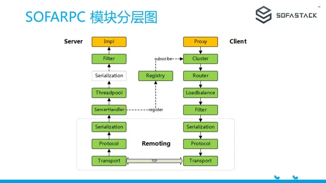 基于这些原则,我们先对 SOFARPC 系统进行了模型分层,在原来的基础上更加细化,左边是服务端的一些模块分层,右边是客户端的模块分层,例如图中的Filter/Router/Cluster/Loadbalance/Serilization/Protocol/Transport。