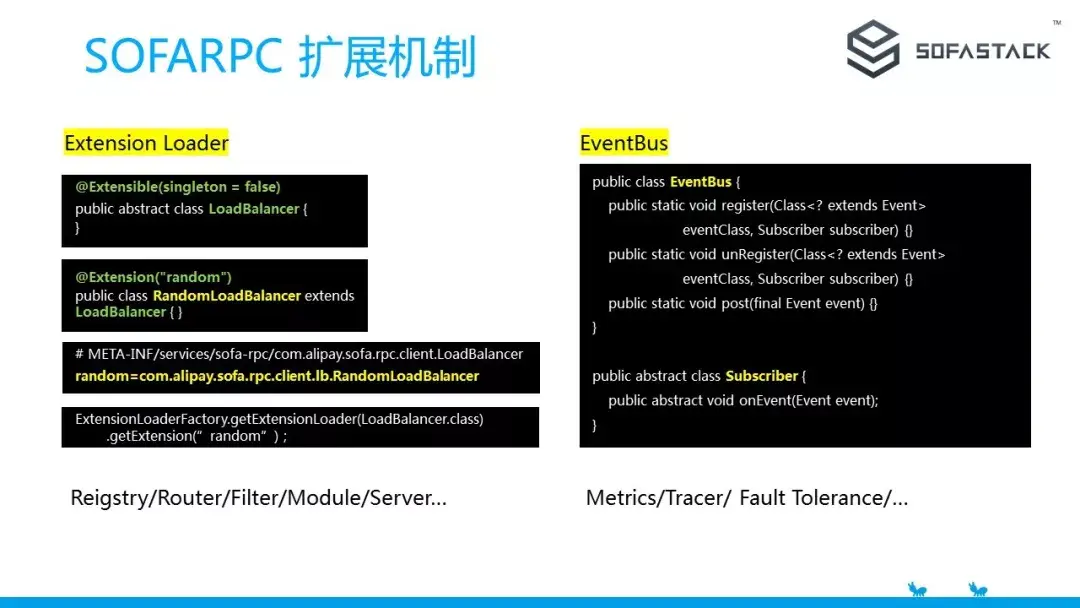 另一种就是右侧示例代码展示的 Eventbus(事件总线)机制,在整个 RPC 调用过程中,不同的阶段都会产生不同的事件,这些事件都会发送到事件总线。如果某个扩展能力在事件总线上监听某个事件,那么就可以同步或者异步的处理这些事件,再进行一些能力扩展。目前 Metrics/Tracer/Fault tolerance 等等是通过这个扩展方式实现的。