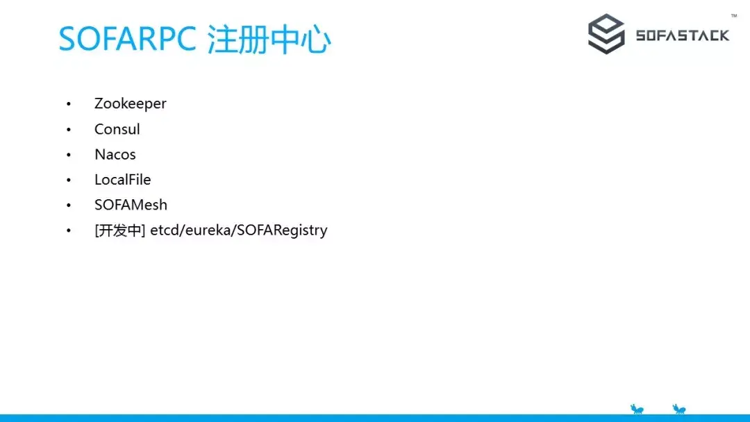 注册中心也是扩展能力之一,目前我们能对接的有 Zookeeper,Consul,Nacos等等,社区也在帮我们共建其它例如 etcd eureka 等的注册中心实现。如果我们的注册中心 SOFARegistry 开源了,SOFARPC 也会第一时间进行支持。