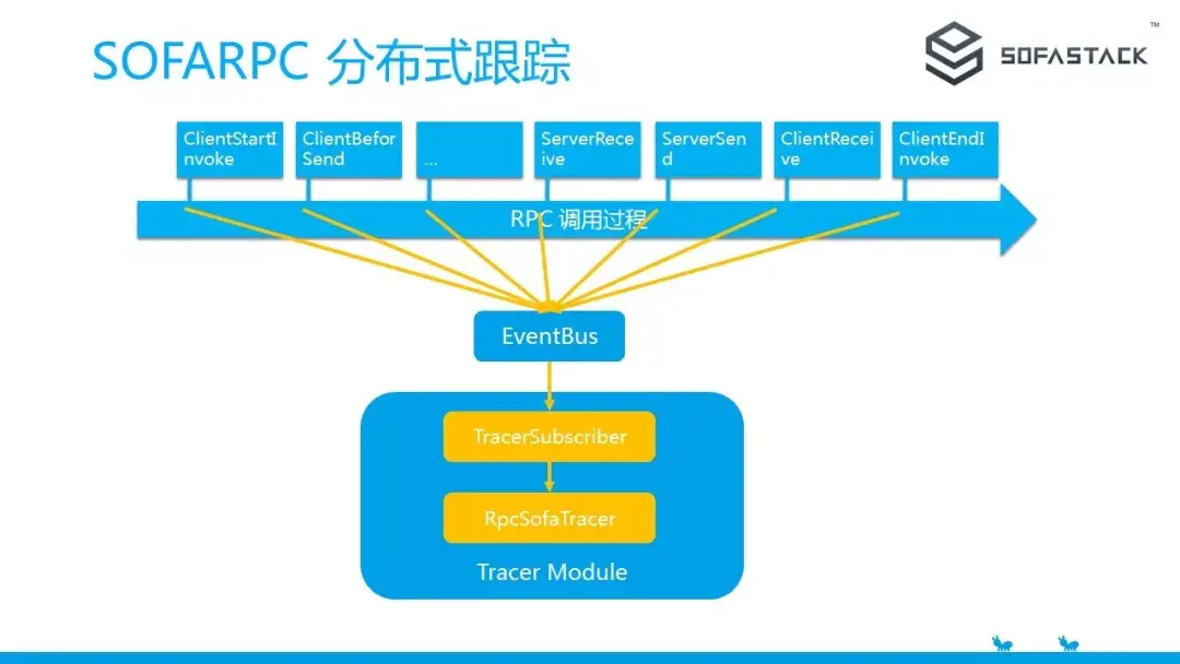 这个 SOFATracer 就是根据之前提到的 EventBus 扩展实现的。可以看到请求的各个阶段都会有事件产生,例如开始调用,开始发送数据,收到请求,收到响应等等,这些阶段都会产生事件到事件总线。而 SOFATracer 模块里就有一个订阅器,订阅了这些事件,并进行相关记录。