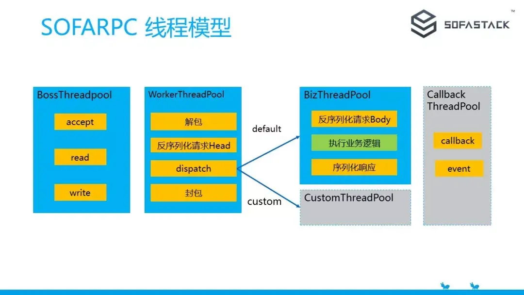worker 线程池处理具体的数据的解包和封包动作,另外在 worker 线程里会做反序列化请求的头部,如果请求对应的接口设置了业务自定义线程池,则分发到这个线程池。否则的话分发到默认的业务线程池。