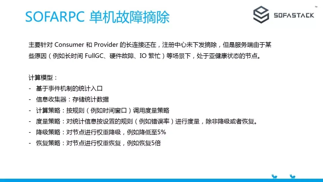 其中一个是 SOFARPC 内置一个单机故障摘除的能力。该能力主要针对的是那种在 Consumer 和 Provider 的长连接还在,注册中心未下发摘除,但是服务端由于某些原因(例如长时间 FullGC、硬件故障、IO 繁忙)等场景下,处于亚健康状态的节点。这类节点往往的表现就是调用超时等异常率高等动作。