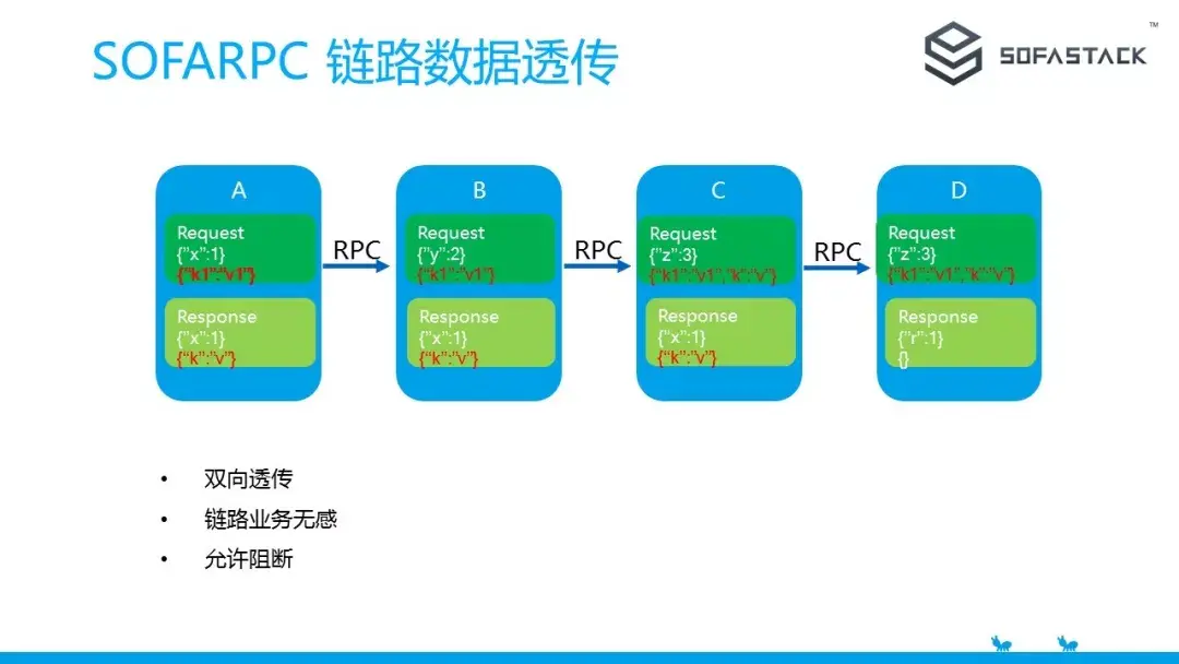 另外一个特性就是链路透传。其实 SOFATracer 里内置了一个链路数据,而且可以透传到各个组件。不过 SOFATracer 的数据透传是单向的。SOFARPC 基于隐式传参的能力做了一个双向链路透传的能力,可以用于一些鉴权,A/B Test 等场景。业务使用的时候可以方便的使用 API 进行数据的存取,在整个链路上也可以做到业务无感,也可以提前阻断。