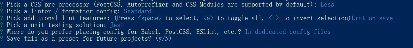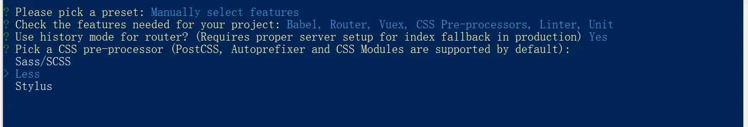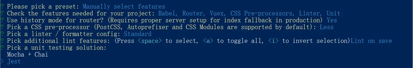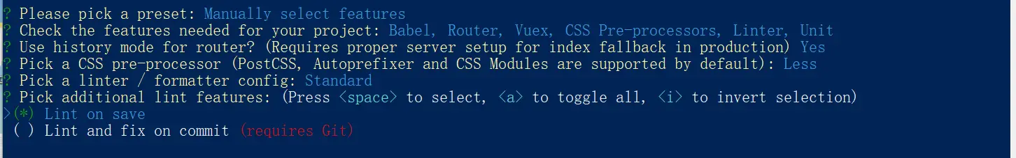 此处我们选择需要Babel编译、使用Vue路由、Vue状态管理器、CSS预处理器、代码检测和格式化、以及单元测试。(上下移动空格选中) 最后确认(Y)