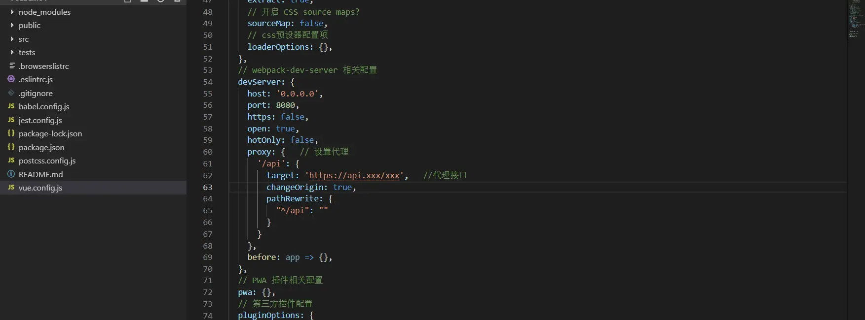 我们可以在项目的根目录下与(package.json同级)新建一个vue.config.js文件,它是一个可选的配置文件,可以修改添加配置(比如开发中用的接口代理proxy,端口号等)