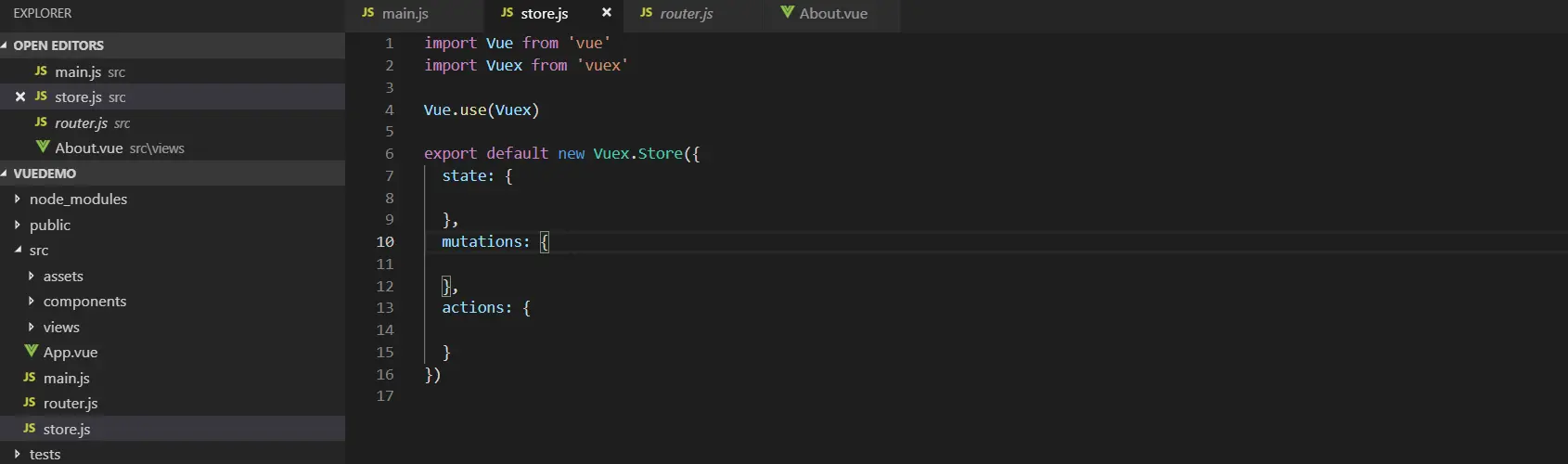 在上面的vue-cli3.0项目创建中我们已经选择了vuex的选项,我们可以在项目中看到一个store.js的文件,就是我们在项目中进行全局状态管理的地方。vuex的核心概念:state、getters、mutations、actions,我们来一个一个讲解使用。