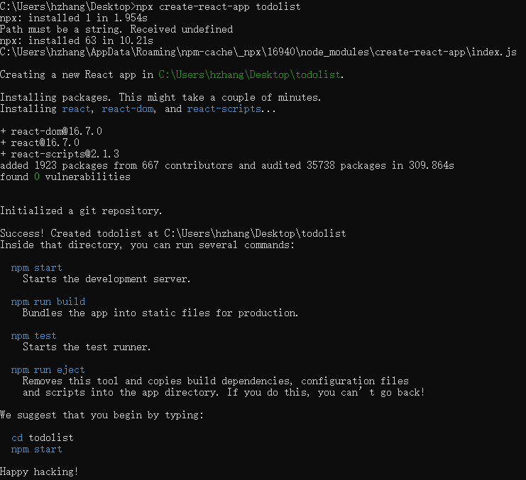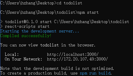 create-react-app会在文件夹内创建相应的文件结构,文件名就是todolist(自己取的) package.json也同样生成了,只需要安装指示,进入相应的文件夹,执行npm start就可以启动项目了