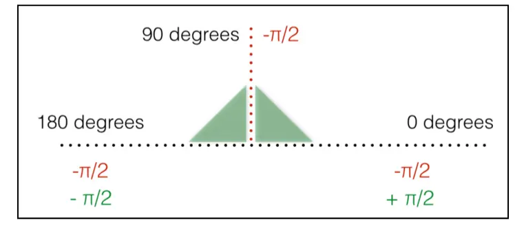 确保所有粒子在出现时以-π/ 2角度直接向上发射。上面的代码指示发射器在(-π/ 2 - π/ 2)= 180度和(-π/ 2 +π/ 2)= 0 度范围内为每个粒子挑选一个随机角度,如下图所示: