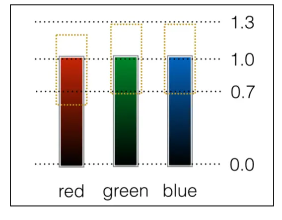 绿色和蓝色分量值现在是 0.7 到 1.3 之间的随机值,但是,高于 1.0 的值的上限为 1.0,因此有效范围为 0.7 到 1.0。 红色成分,因为其 “normal” 值为 0.9,所以它的上限介于 0.6 和 1.0 之间。 这些是相对较窄的范围,因此产生的随机颜色看上去差异不大。