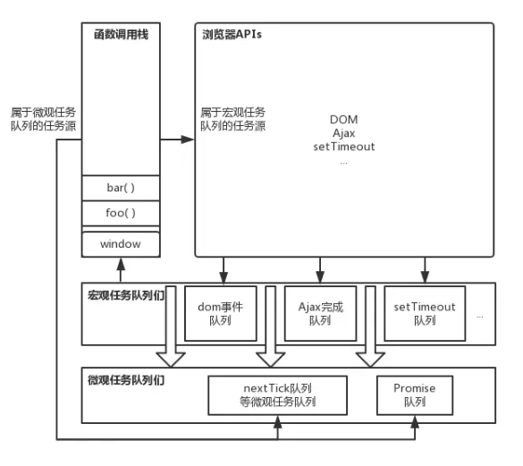 ES6添加了微观任务队列之后在执行栈执行的过程中会把属于微观任务队列的任务分配到相应的微观任务队列中去。而在调用栈执行空之后,主线程读取任务队列时,会先读取所有微观任务队列,然后读取一个宏观任务队列,再读取所有的微观任务队列。如图: