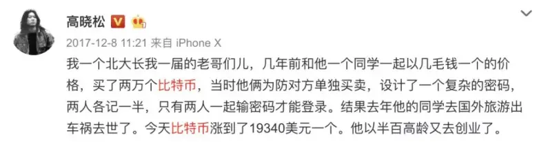 高晓松曾在17年比特币价格接近历史最高价时,发过这个帖子: