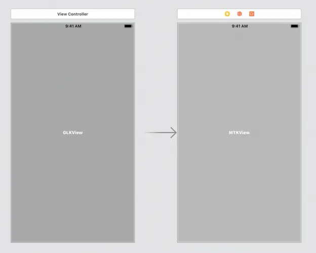 打开Main.storyboard。 在此示例中,故事板包含两个场景,均命名为View Controller Scene。 一个有GLKView,另一个包含MTKView和你刚刚添加到源代码的outlet的连接。
