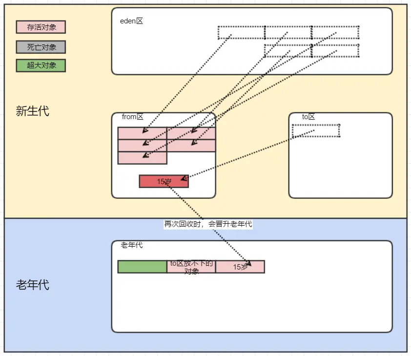 (5)程序继续运行,假设经过15次复制,某一对象依然存活,那么他将直接进入老年代。