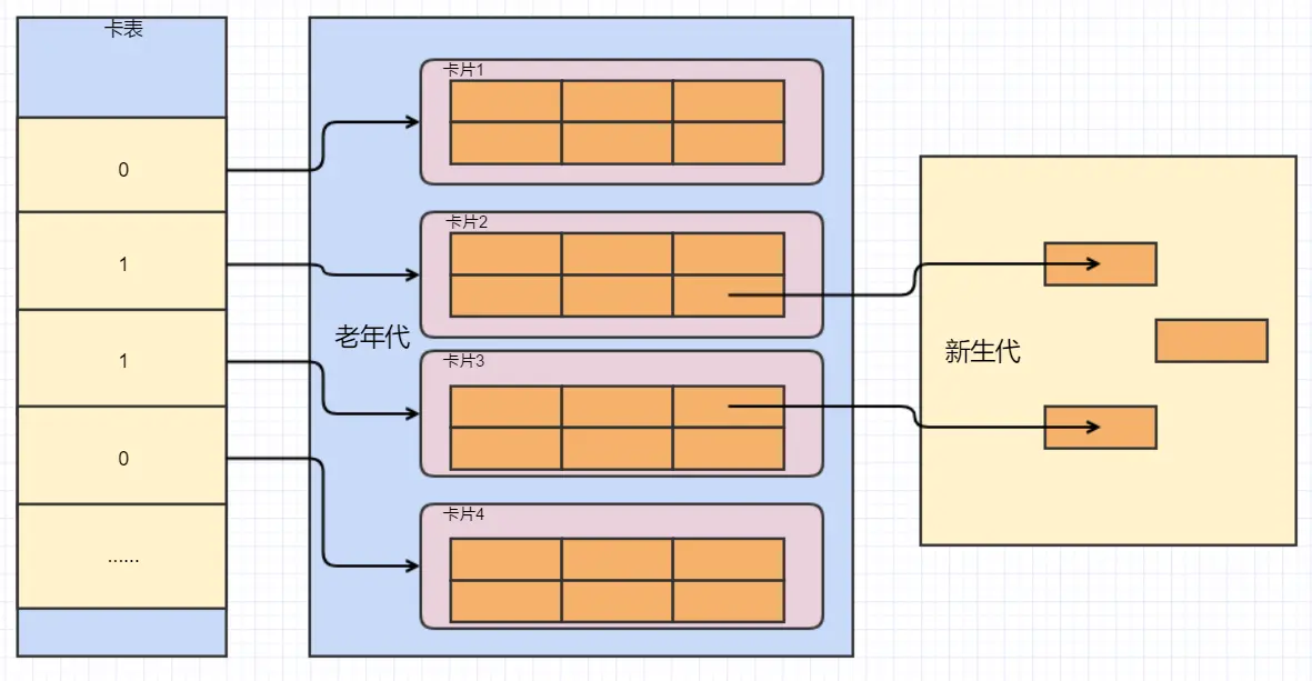 这种方法会将老年代内存平均分为很多的卡片,每个卡片都包含一部分对象,然后维护一个卡表,卡表是一个数组,每个元素指向一个卡片,并标识出这个卡片中有没有指向新生代的对象,如果有标识为1。这样一来,Minor GC只需要扫描卡表中标识为1的卡片即可,大大提升了效率。