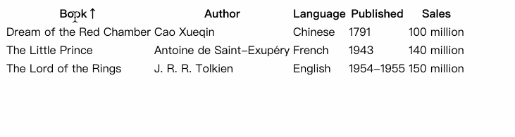 "Book", "Author", "Language", "Published", "Sales"