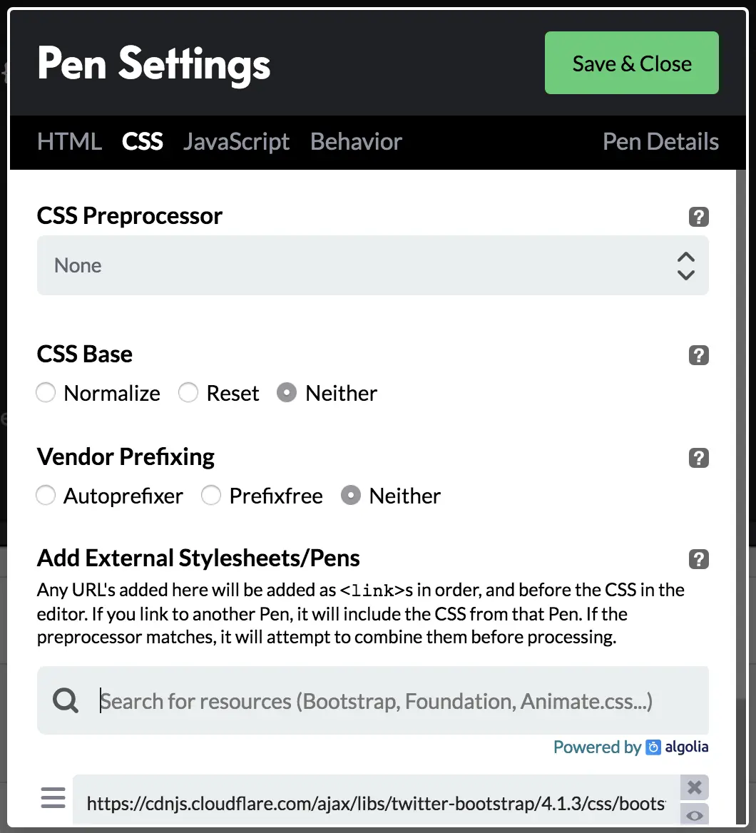 Once you’re on the Pen, you can import popular open-source libraries. You do that by opening Settings and then heading to either the CSS or JavaScript tabs where you can then search for the library you want to add.