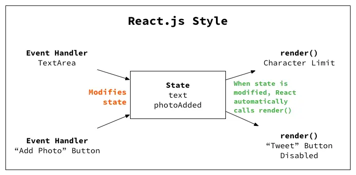 The state becomes an intermediary thing which sits in between the event handlers and render():