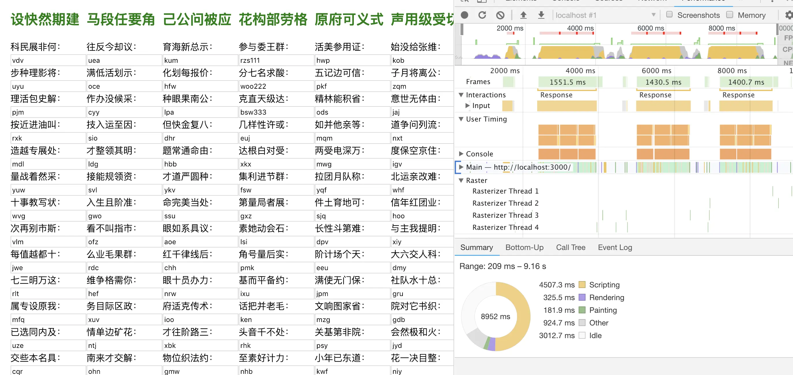 接下来用不同的浏览器测试,数据来源换成生成好的JSON(保住数据完全相同),增大数据量都试过,在浏览器不卡死能渲染的情况下,这几种情况下的渲染时间居然是不相上下。
