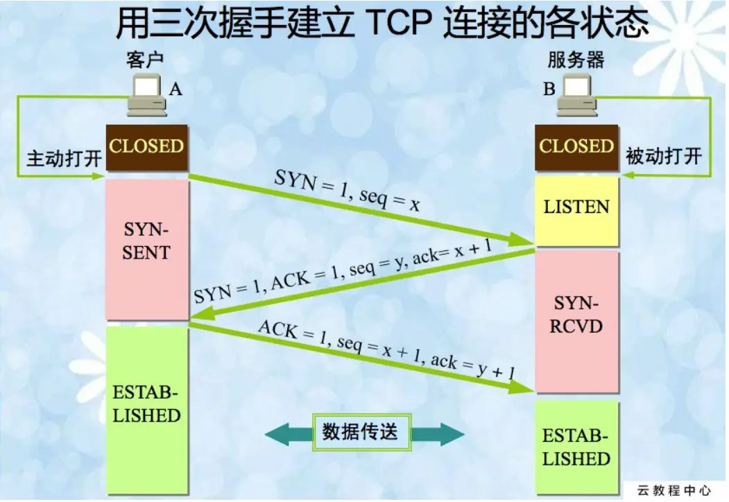 - 客户端发送确认的 ACK 报文,设置确认序号为 Y + 1,发送序号为 X + 1。
