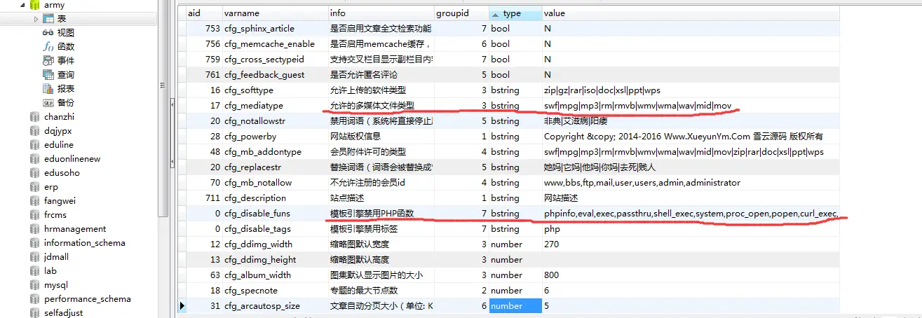 2、上传类型后缀名、禁用的函数名等敏感配置,这类配置参数,其实放在代码里就行。而织梦将其放在了数据库: