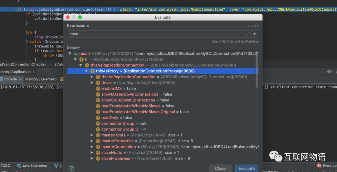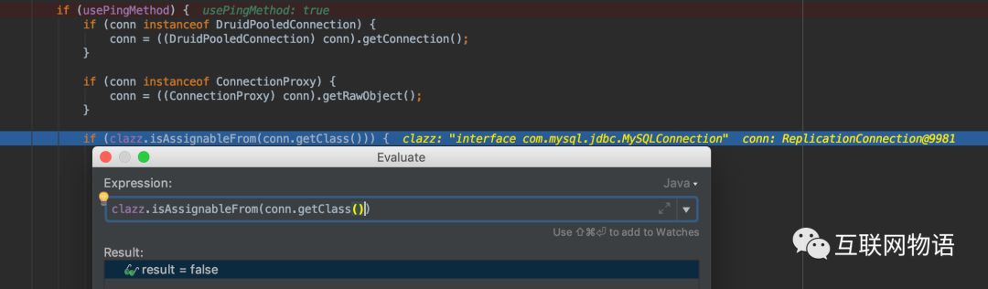通过调试,我发现clazz.isAssignableFrom(conn.getClass())为false,也就是说这里的conn并不是com.mysql.jdbc.MySQLConnection,原来为了DB的读写分离项目使用的是数据库驱动是RepliationDriver而不是默认的Driver( jdbc:mysql:replication://), 因此使用的连接也是com.mysql.jdbc.ReplicationConnection,