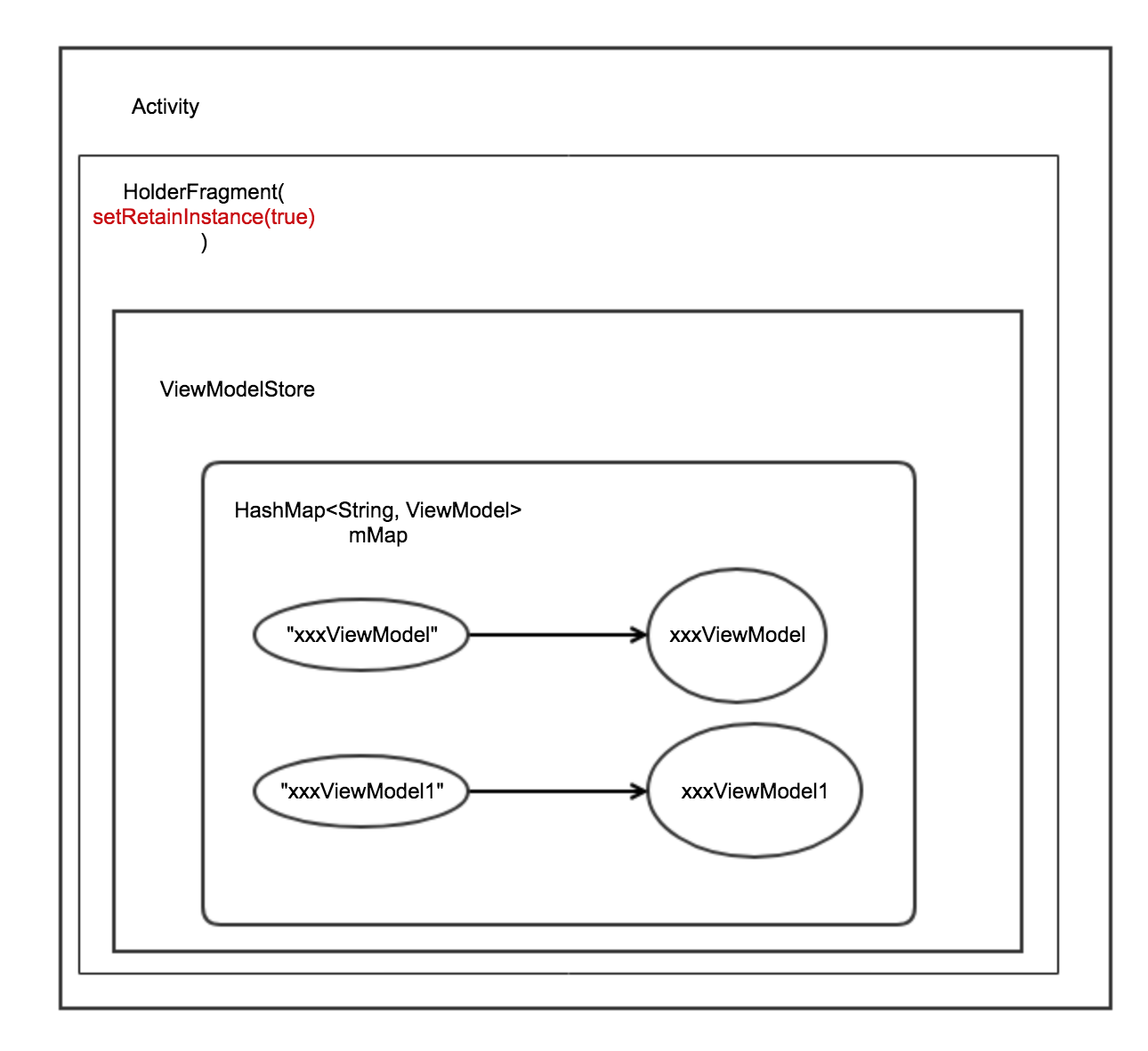 具体源码分析推荐可以阅读这篇文章,基本原理是在Activity上add一个setRetainInstance(true)的HolderFragment,由其保存对应Activity的ViewModelStore,在Activity重走生命周期后,在onCreate()中再次通过ViewModelProviders.of(this)找到对应的HolderFragment的ViewModelStore,并通过get(xxxViewModel.class)以class为key,找到存在ViewModelStore中的ViewModel。