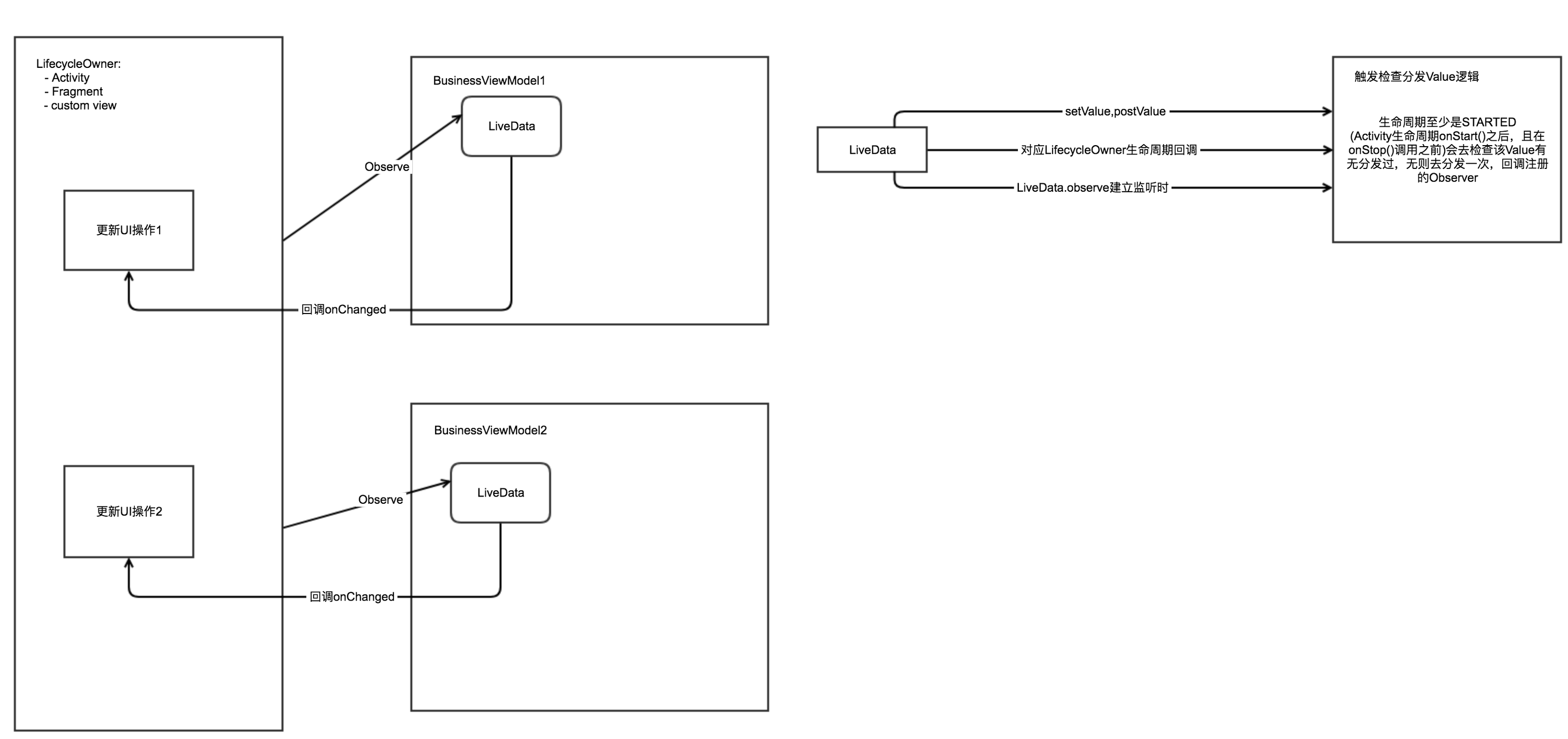 LiveData的功能在于,在于setValue时(非UI线程使用postValue),会根据当前界面的生命周期(通过在界面上add一个无界面的ReportFragment,接收其生命周期回调来实现,很经典的做法,Glide比起其他的图片加载库有感知生命周期的功能也是这么做的),选择要不要回调到UI界面更新(在对应的Activity调用onStart()之前,onStop()之后,都是不会更新界面的),那么如果遇到这些情况,LiveData会选择在每一次对应界面的生命周期变化时,以及调用LiveData.observe()建立监听关系时再去尝试回调UI更新