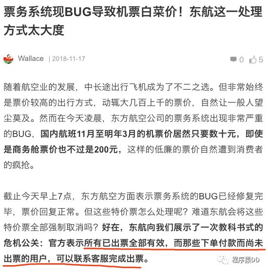 先不论这些是不是事实,谈到这个问题的时候,让我联想到前段时间,东航票务系统Bug导致的白菜价机票事件,当时还有前同事有抢到非常廉价的票而晒了朋友圈。随后,东航当时的处理被誉为一次教科书式的危机公关 ,对于因Bug导致的机票全部有效,看看当时的报道: