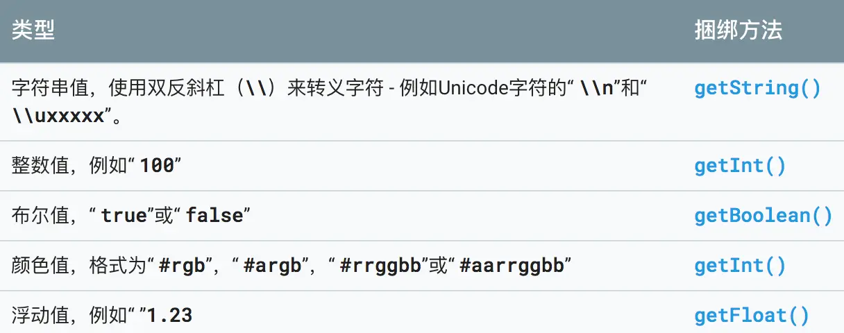 android:name:键名,唯一标识android:resource:资源ID,通过Bundle.getInt()获取其值android:value:键值,类型和获取方法如图: